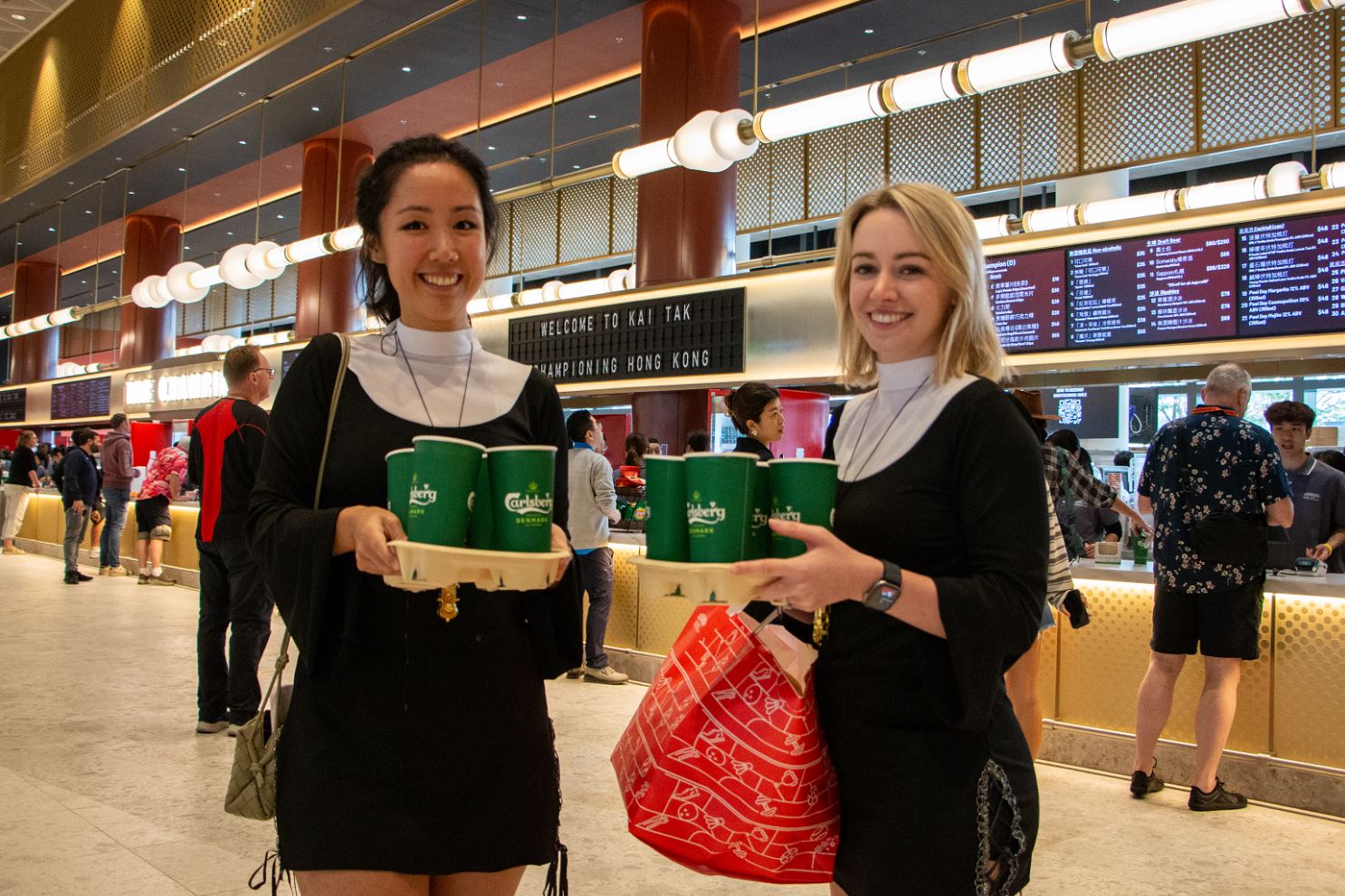 位於主場館東大廳二樓,以「長達100米」、「亞洲最長酒吧」作焦點的冠軍酒吧,未到中午時段,購買啤酒的人流絡繹不絕。現居新加坡的Laura和Sarah,繼去年於香港大球場首次觀賽,今日再度入場享受七欖賽事。二人原在南看台欣賞球賽,但礙於購買時南看台旁小食部食物暫時售罄,決定轉移下單陣地。