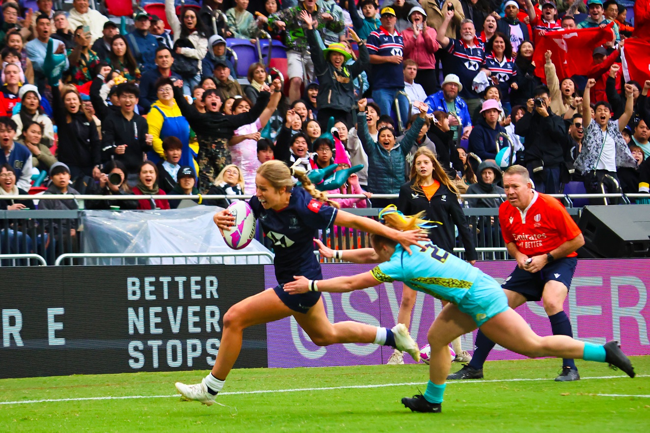 「2025年香港國際七人欖球賽」壓軸的第三日(30日)賽事,繼續在啟德主場館上演。矚目的「Melrose 女子銀劍賽」決賽,港隊展現驚人得分能力,在上半場領先14分的優勢下,於下半場把握優勢,最終以45比5擊敗哈薩克,以全勝姿態拿下冠軍。