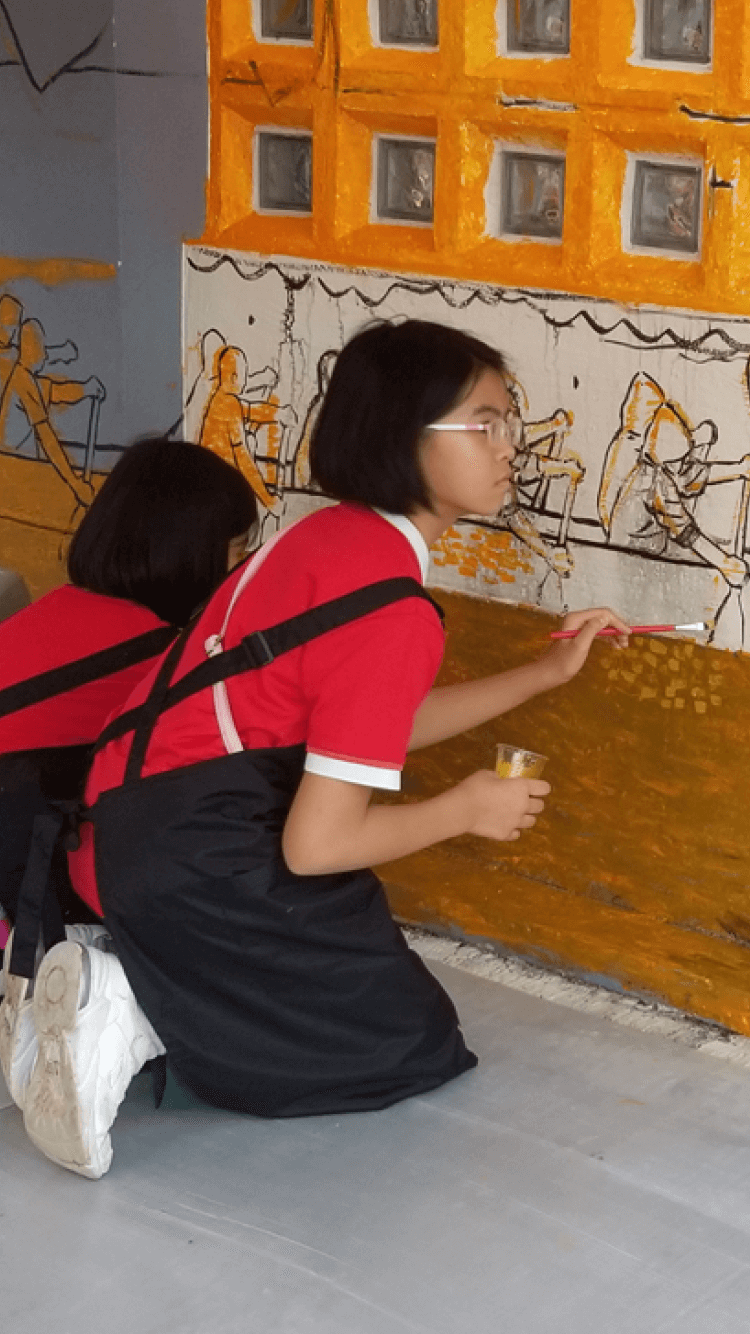 Around 60 CARE Team volunteers joined in at the Lions Club Lam Tsuen Youth Centre on 8 and 9 June 2024. To bring more vibrancy to Lam Tsuen Wishing Square, volunteers also helped re-paint another mural made by Environmental Association Limited located at the Wishing Square, reviving the images of the earth and farmland.