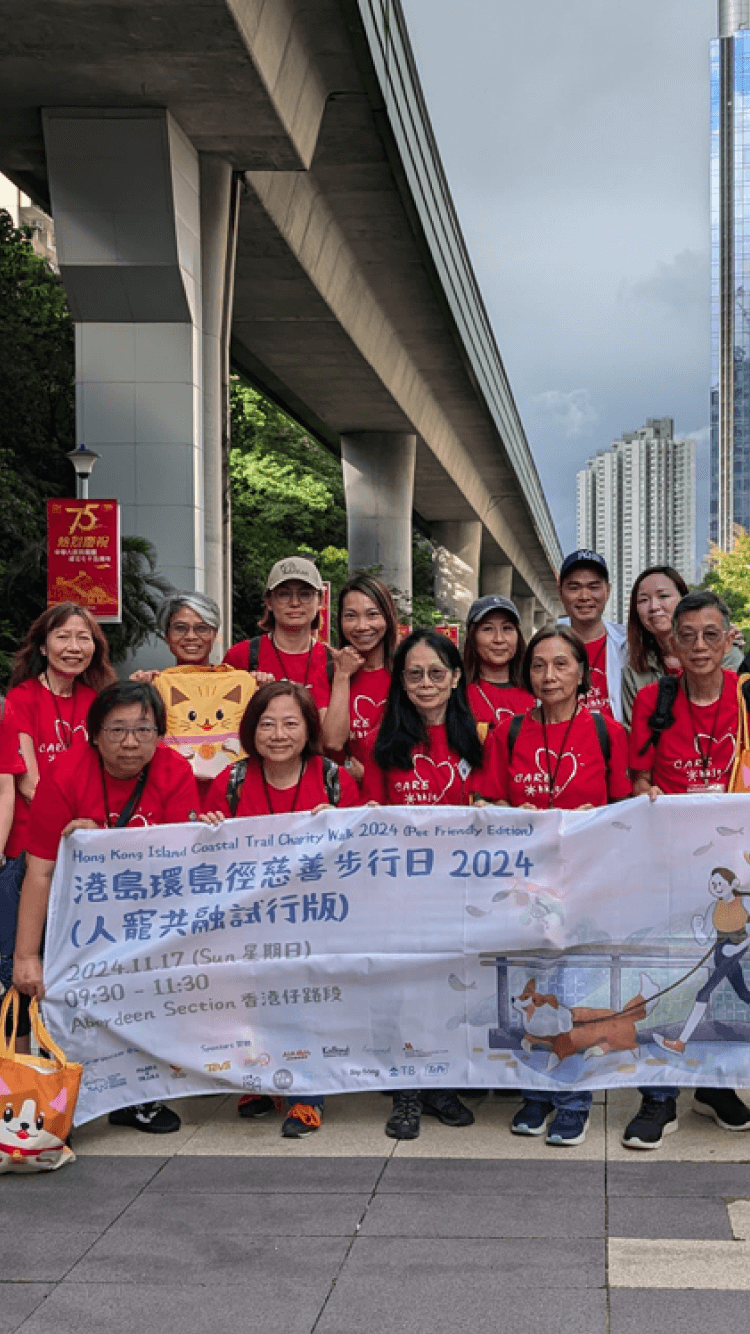 The CARE@hkjc Team sent 25 volunteers to support the "Hong Kong Island Coastal Trail Charity Walk 2024 (Pet-Friendly Edition)", co-organised by the nature conservation organisation Parks and Trails and Paws Hero, a non-profit organisation dedicated to bettering the lives of animals. The volunteers provided venue support, including assisting participants with registration, distributing gift packs, conducting checkpoint quizzes, as well as cheerleading at checkpoints and finish lines.