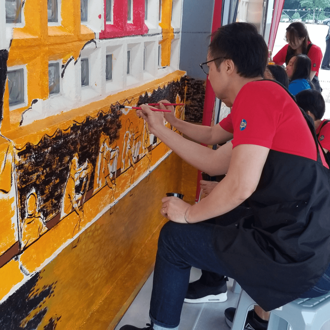 約60位馬會義工及其親友於2024年6月8日及9日到獅子會林村青年中心支援壁畫繪製工作。為了令林村廣場更展現活力色彩,是次計劃特別為青年中心旁邊的環保協進會修補原有壁畫,令傳統智慧樂活館牆上的地球和農田圖案重拾色彩。